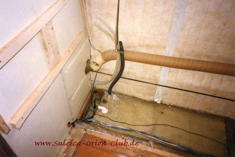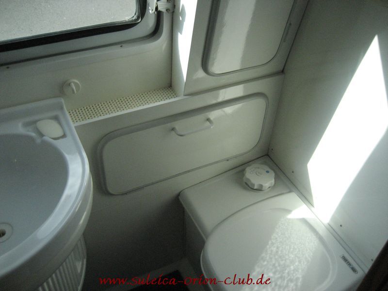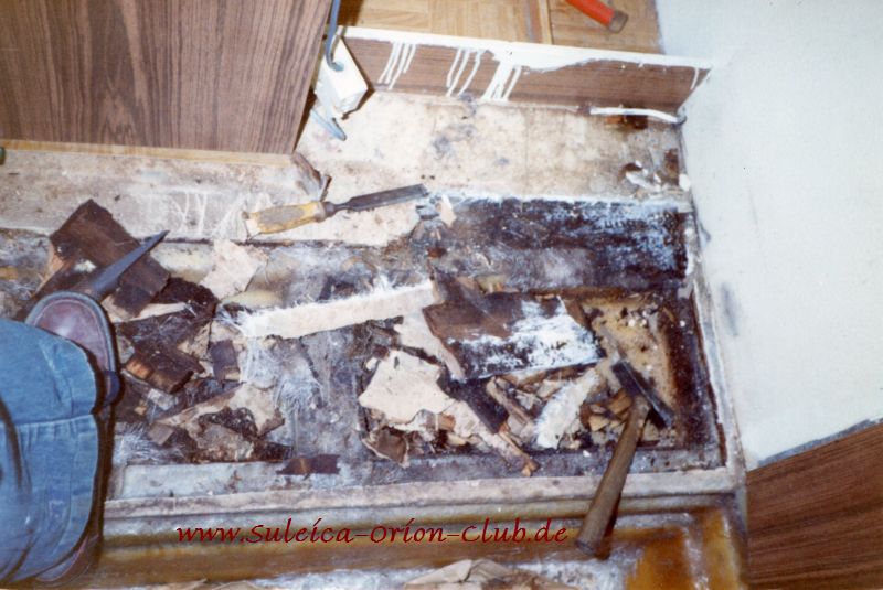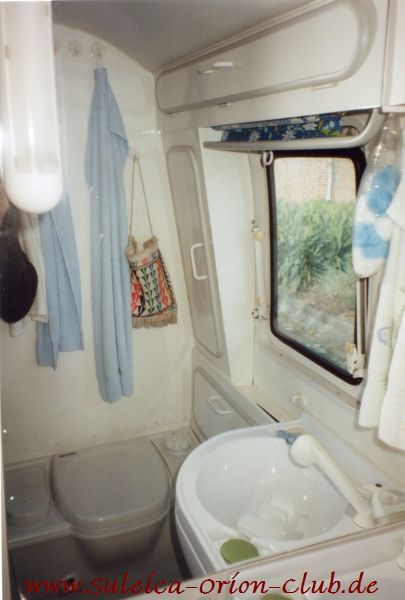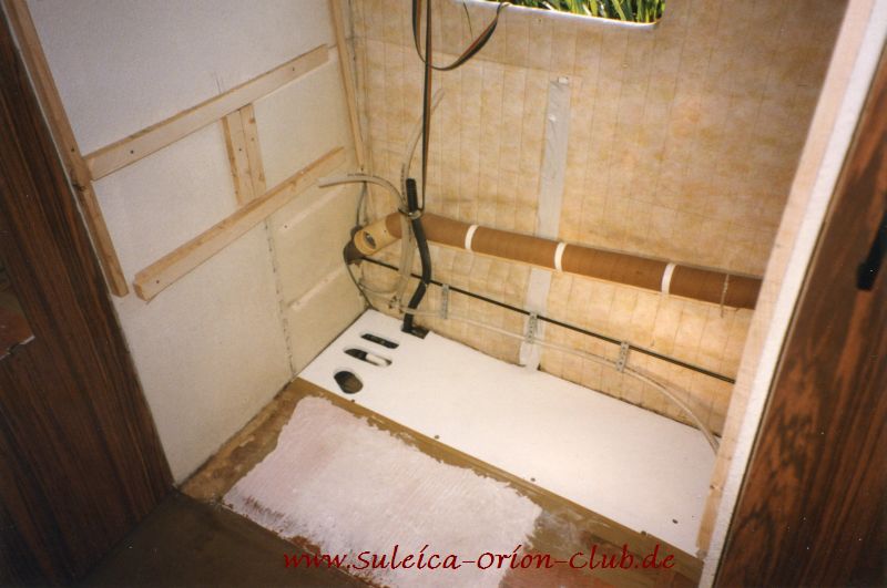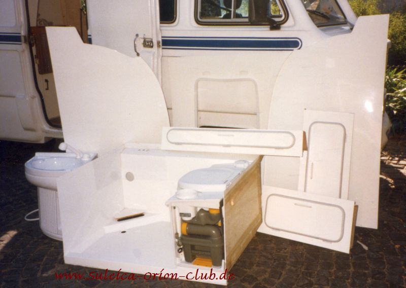 Der Waschraum im ORION Typ 1 mag Ende der 60er und Anfang der 70er Jahren angemessen und komfortabel gewesen sein, aber schon beim Kauf meines gebrauchten im Jahre 1981 gefiel mir dessen Waschraumaufteilung nicht. Außerdem war dem Vorbesitzer bereits der Fußboden verfault, weil seine Toilette nicht dicht war, und er das Waschwasser in die Toilette geleitet und zum Überlaufen gebracht hatte.