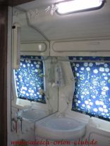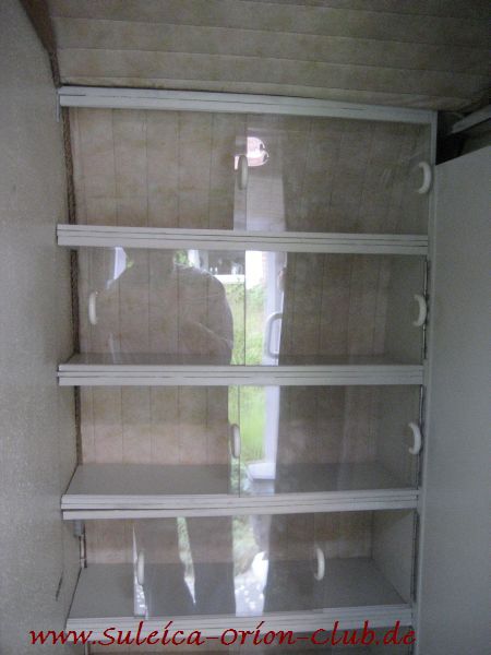 Zur Außenwand hin sind verschiedenen flache Schränkchen eingebaut, dringend notwendig für Haarspray, Kosmetika und sonstigen Kram. Die Türen haben umlaufende Kunststoffprofile und sind mit kräftigen Magnetschnäppern gehalten.