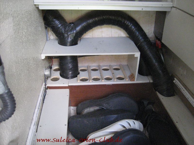 Durch die beiden Luftkanäle ergibt sich am Schrankboten ein Schuhfach .Darüber ist eine nach oben offene, auf Schienen laufende Schublade . Die Kleiderstange wurde höher gelegt.